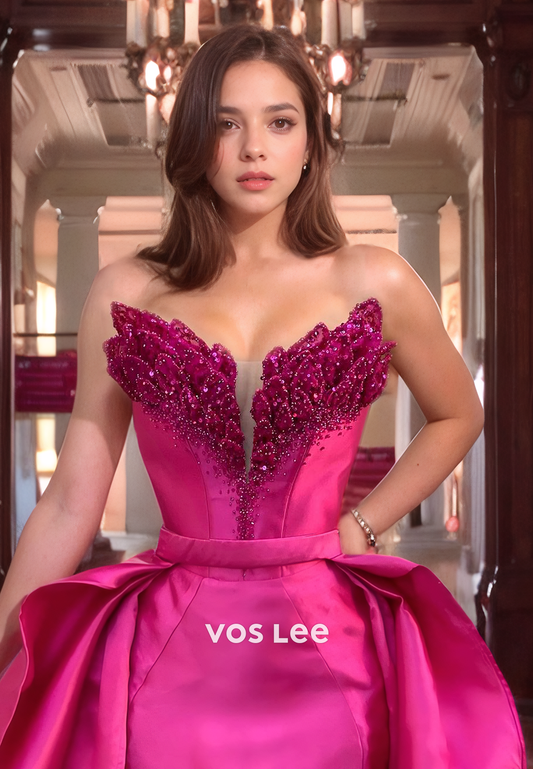A-line Fuchsia Sweetheart Satin Formal Evening Prom Dresses with Pockets Luxury Detached Train Party Gown