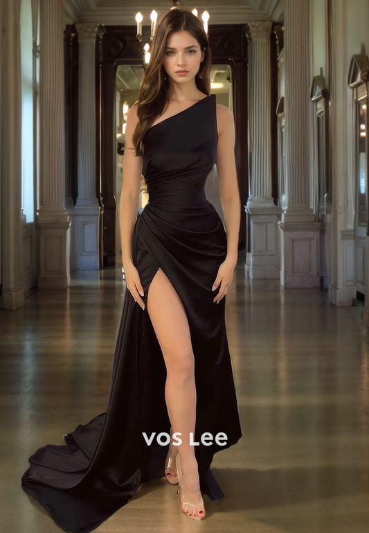 Simple Black One Shoulder Prom Dress High Split Floor Length Elegant Evening Party Dress