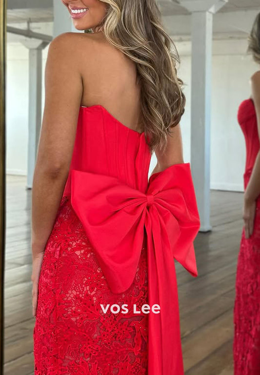Gorgeous Red Strapless Lace Prom Dress With Bow Split Floor Length Party Dress