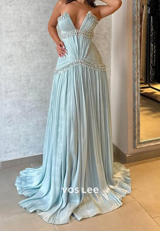 Charming Blue Pleat Prom Dress Crystals Long Dresses Party Gown
