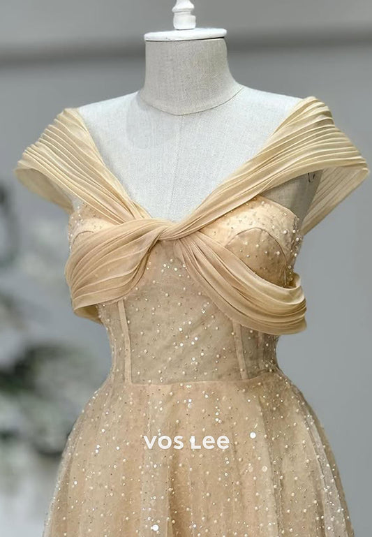 Champagne Sequins Beading Evening Dress A-line Prom Gown Party Gown