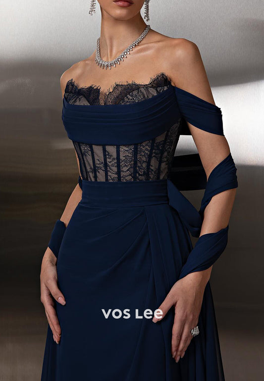Dark Navy - Sweetheart Lace Floor-Length Pleated Sheath Evening Dresses