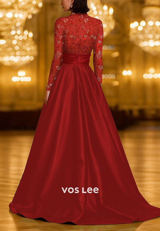 Elegant A-Line Lace Long Sleeve Satin Evening Gown