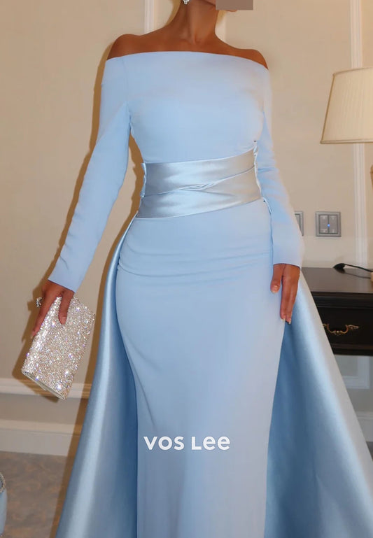Charming Blue Satin Mermaid Evening Dress Off The Shoulde Long Sleeve Formal Dress