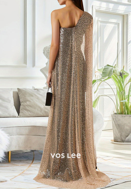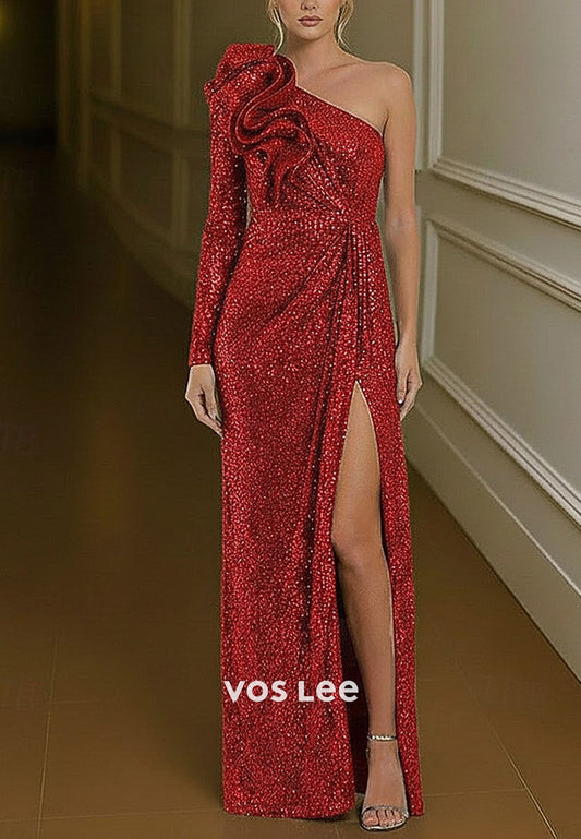 Sparkling Sequin One Shoulder Ruffled Evening Dress Split Formal Gowns