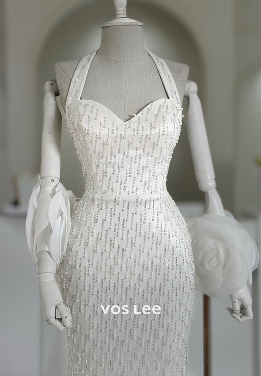Halter Sleeveless Sequins Beaded Mermaid Prom Dresses with Sweep Train