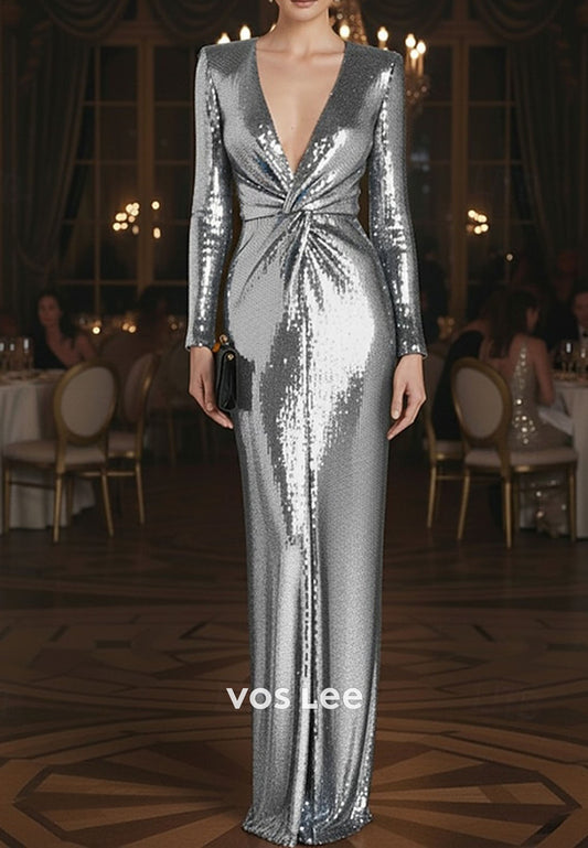 Sequins V Neck Long Sleeve Mermaid Pleat Long Evening Gowns