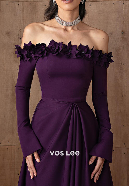 A-Line Long Sleeve Off the Shoulder Floral Embossed Pleated Evening Gowns
