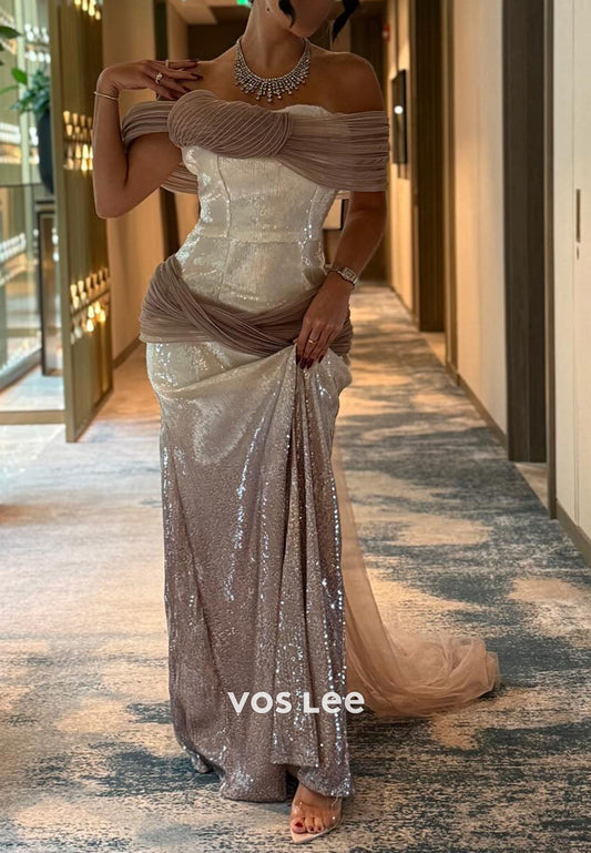 Off the Shoulder Fully Sequined Mermaid Evening Dresses with Sweep Train