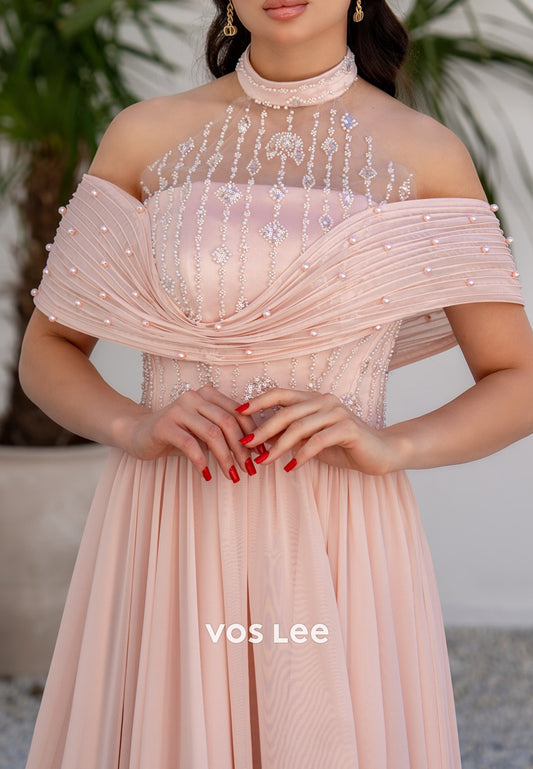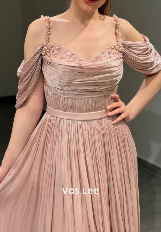 Blushing Pink A-Line Off the Shoulder Beaded Sequins Pleated Prom Dresses