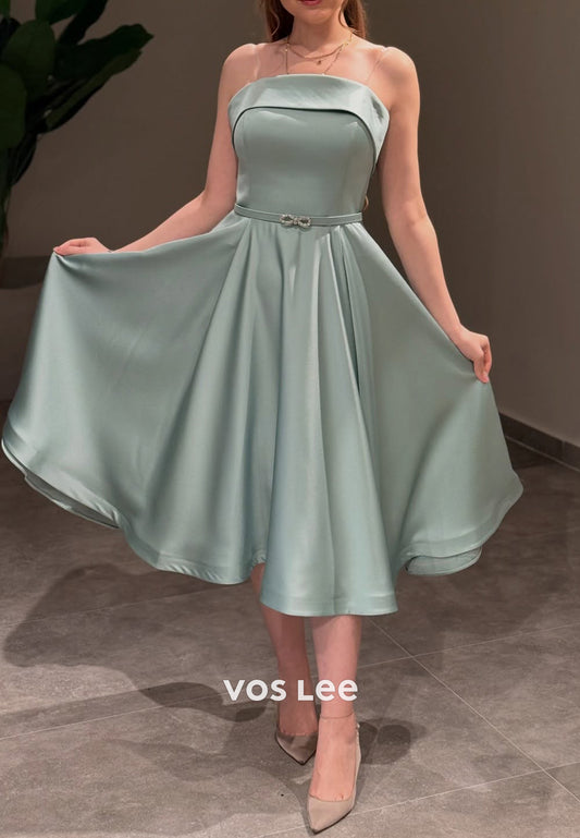 A-Line Strapless Rhinestone Embellished Tea-Length Evening Dresses