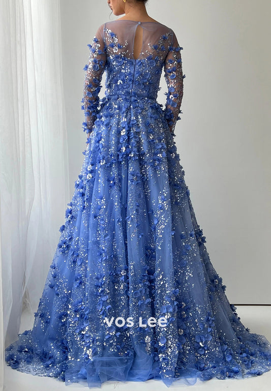 A-Line Long Sleeve Illusion Neck Appliques Lace Prom Dresses with Court Train