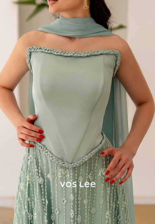A-Line 3/4 Sleeve V Neck Beaded Pearls Pleated Ankle-Length Evening Dresses