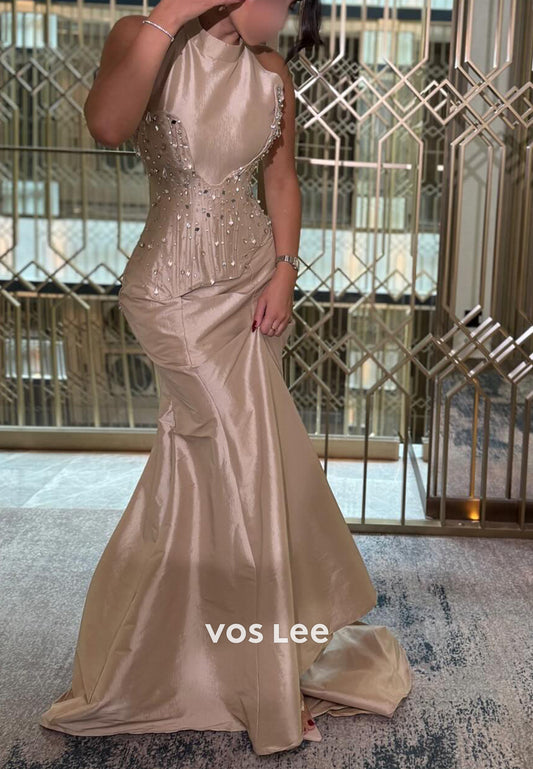 Halter Rhinestone Embellished Mermaid Evening Dresses with Sweep Train