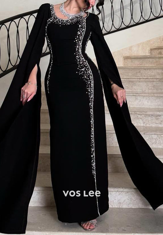Long Sleeve Scoop Beading Embellished Floor-Length Sheath Evening Dresses