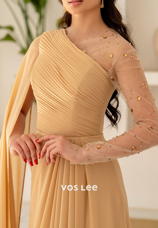 Long Sleeve One Shoulder Pleated Rhinestone Mermaid Evening Dresses with High Split