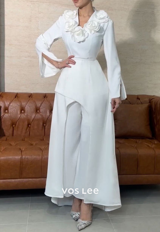 Long Sleeve V Neck Floral Embellished Pleated Jumpsuit Evening Dresses