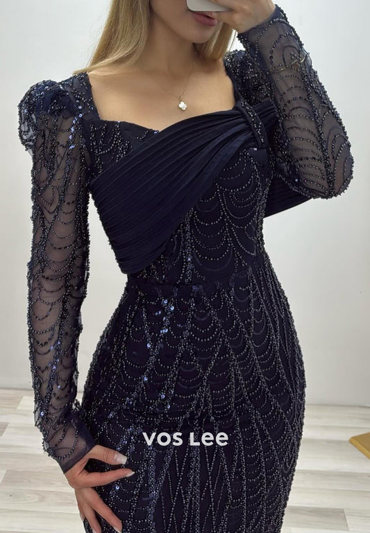 Dark Navy Long Sleeve Scoop Fully Beaded Mermaid Evening Dresses