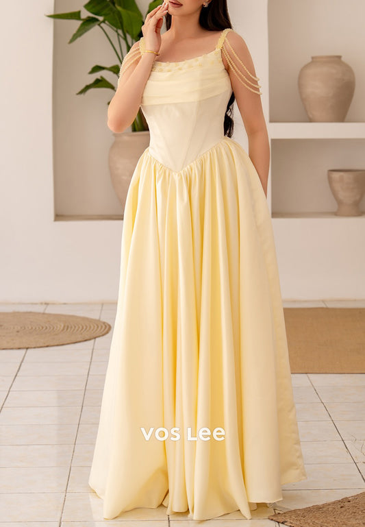 A-Line Scoop Spaghetti Straps Beaded Pleated Long Prom Dresses