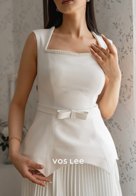 White A-Line Pearl Embellished Pleated Evening Dresses
