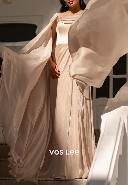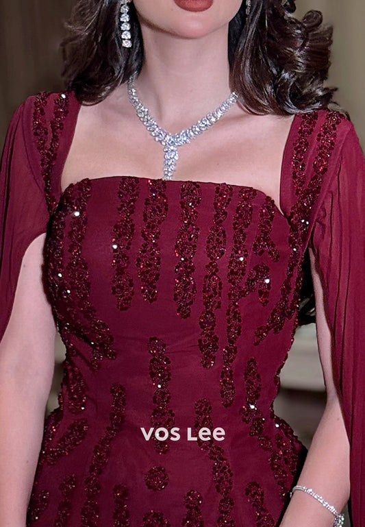 Classic Square Sequins Sheath Pleated Evening Dresses with Sweep Train