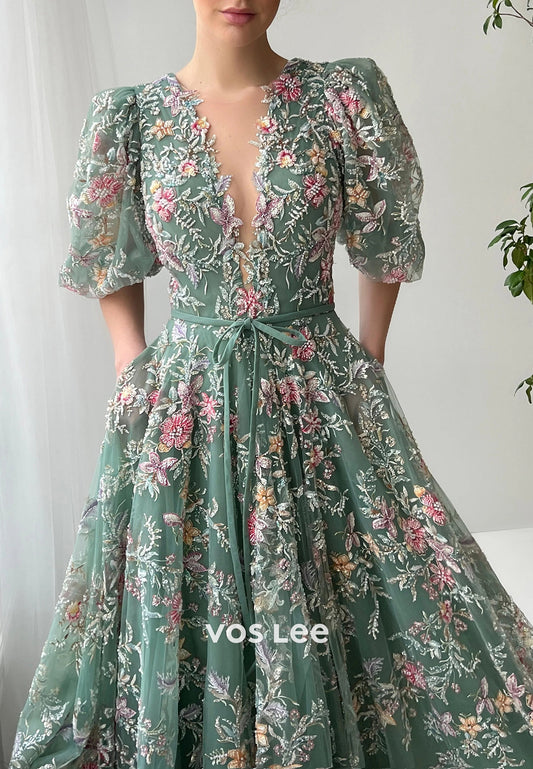 A-Line Short Sleeve V Neck Appliques Lace Floor-Length Prom Dresses