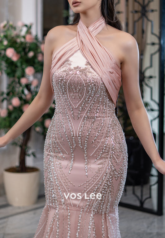Pink Halter Sequins Rhinestone Pleated Trumpet Evening Dresses