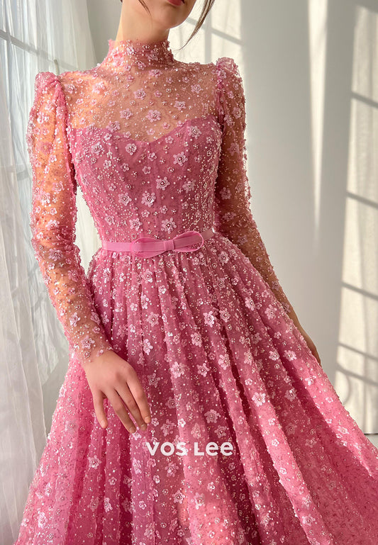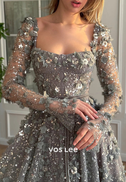 A-Line Long Sleeve Square Sequins Appliques Embellished Prom Dresses