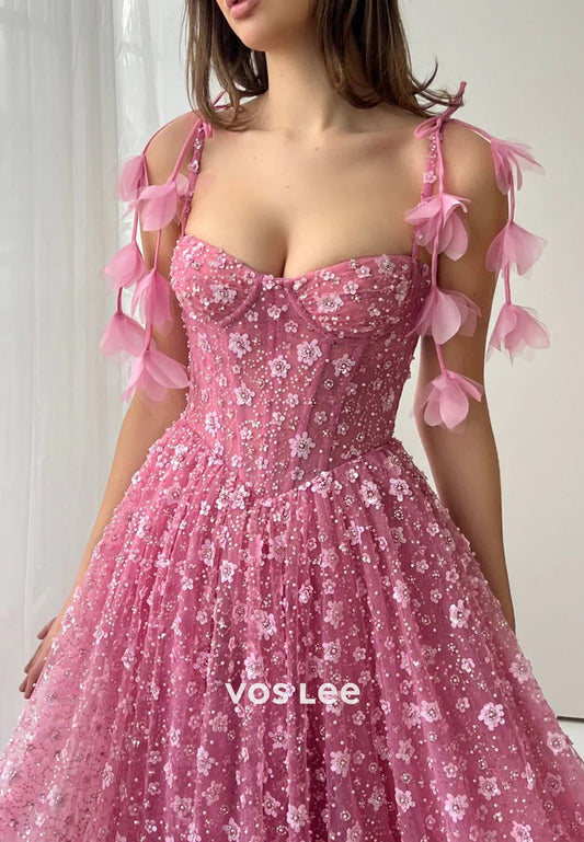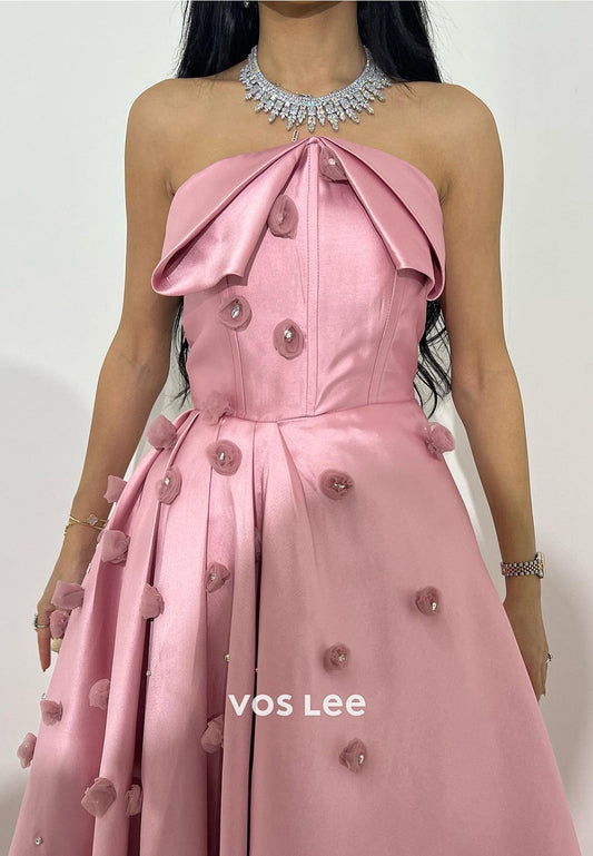 A-Line Pink 3D Flowers Strapless Rhinestone Ankle-Length Evening Dresses