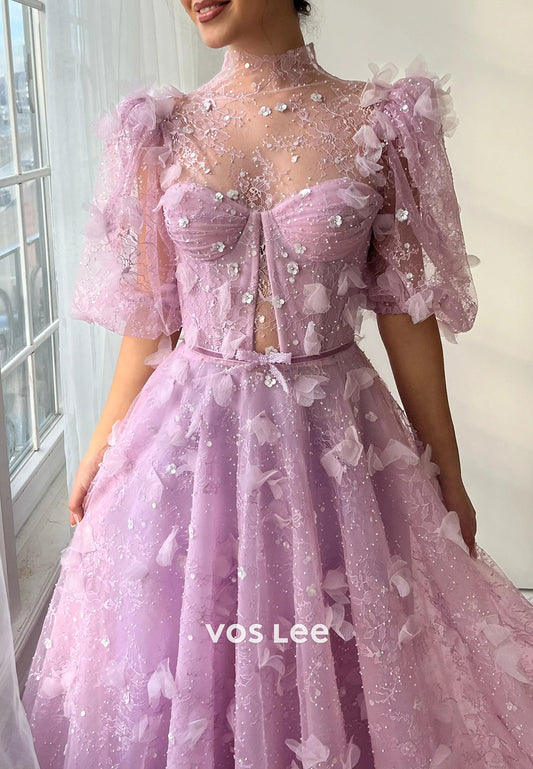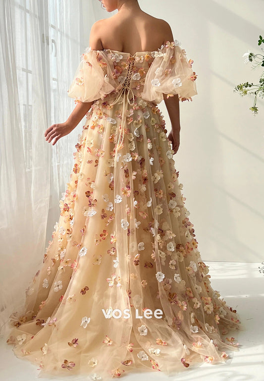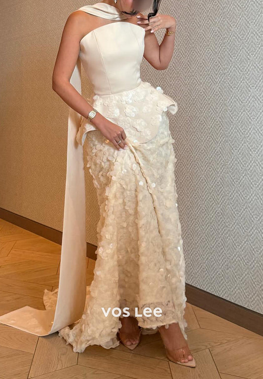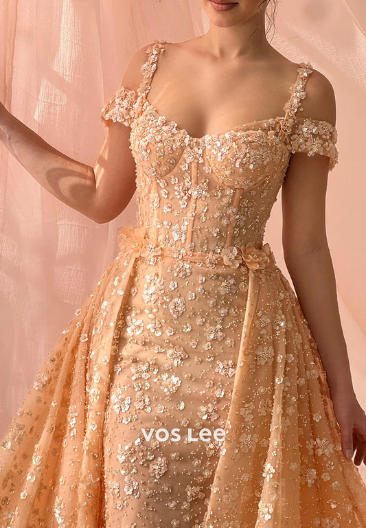 A-Line Short Sleeve Strapless Floral Embellished Prom Dresses with Sweep Train