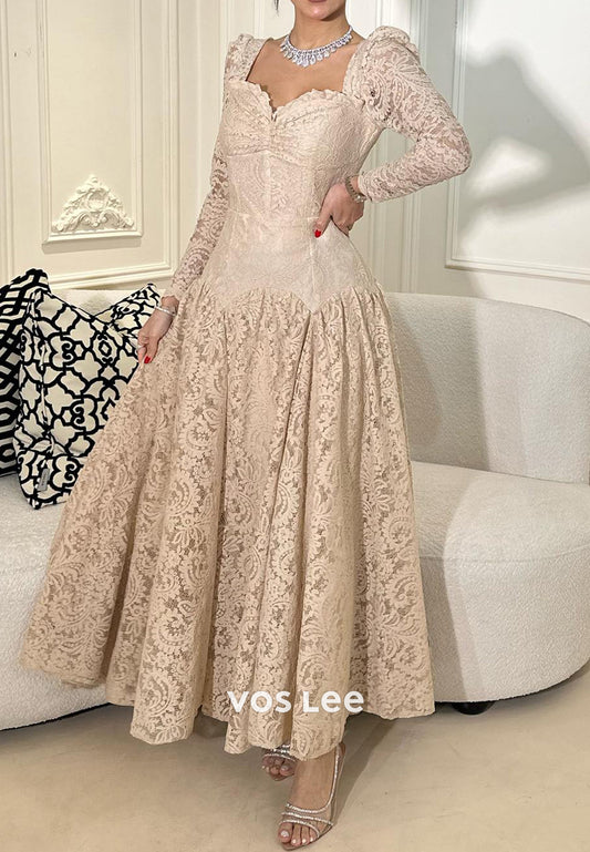 A-Line Long Sleeve Sweetheart Lace Ankle-Length Evening Dresses