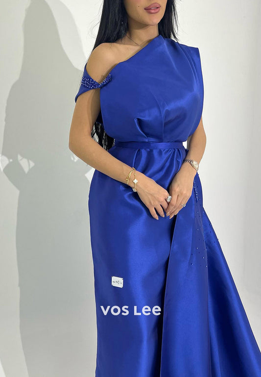 Royal Blue Asymmetrical Neck Sheath Evening Dresses with Sweep Train