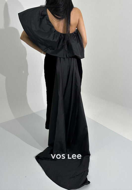 Black Long Sleeve One Shoulder Pleated Mermaid Evening Dresses with High Split