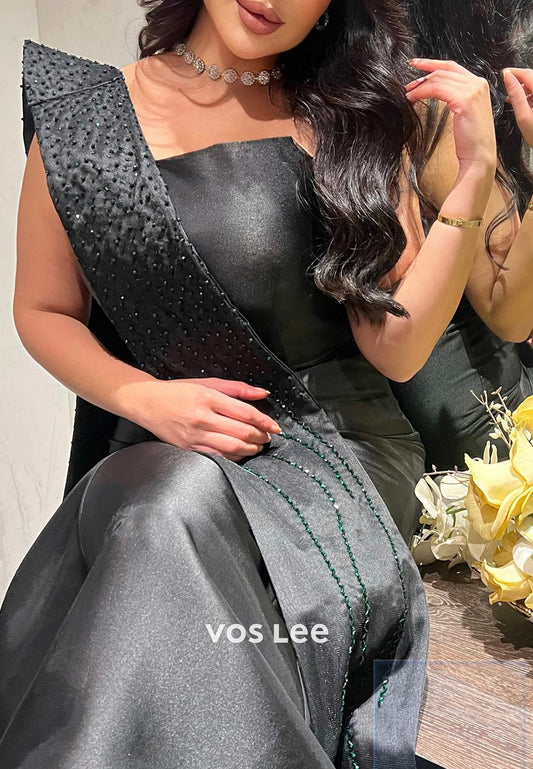 Black Sleeveless Strapless Beading Trumpet Evening Dresses with Sweep Train