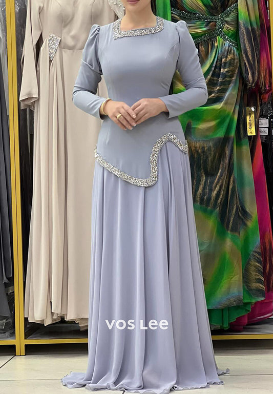 A-Line Long Sleeves Square Rhinestone Pleated Floor-Length Evening Dresses