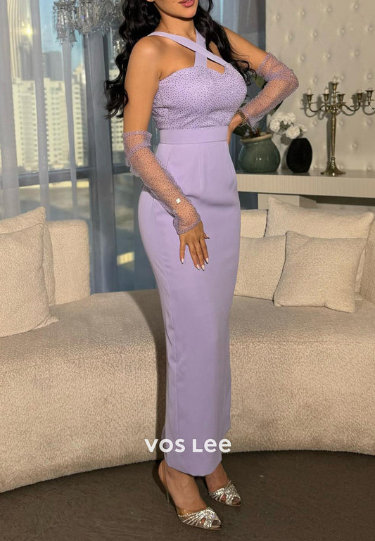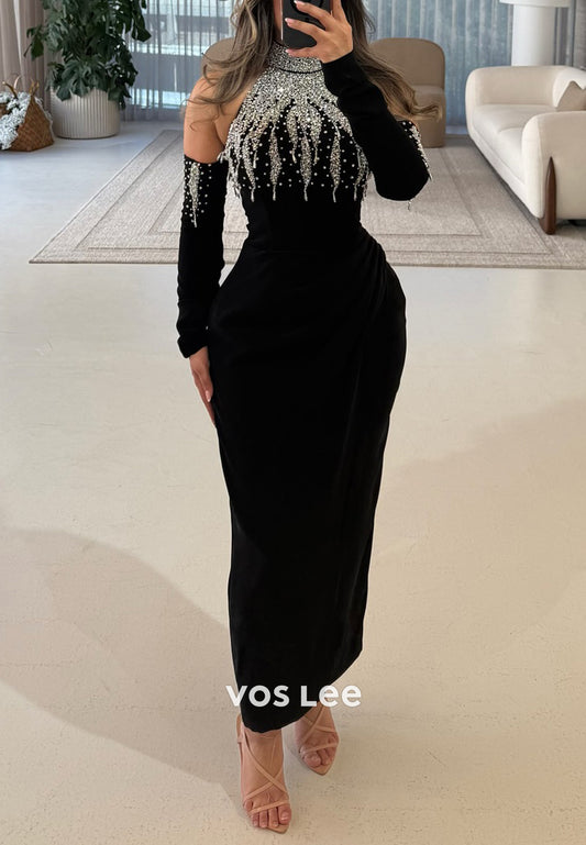 Long Sleeve Halter Rhinestone Embellished Ankle-Length Sheath Evening Dresses