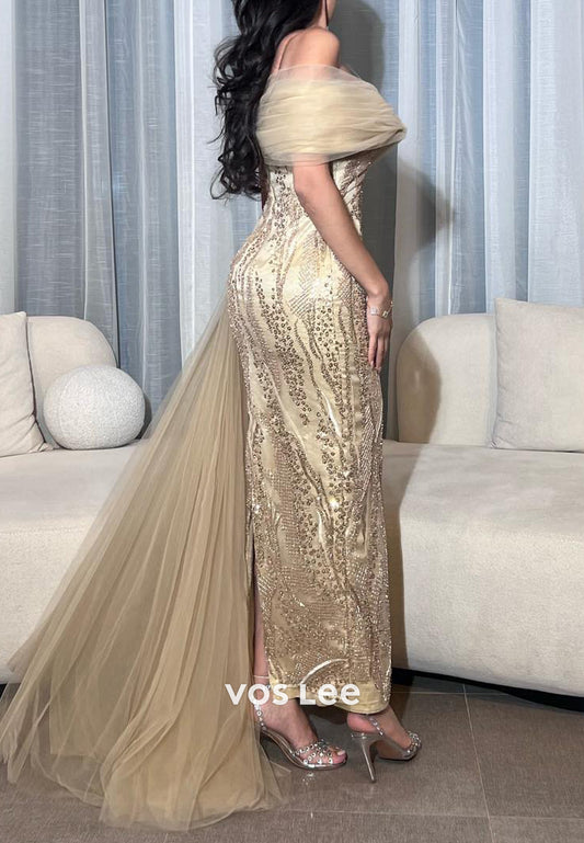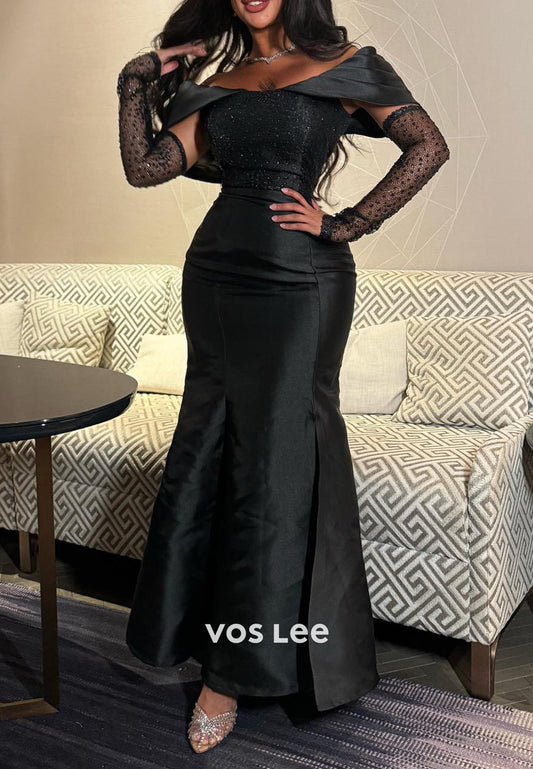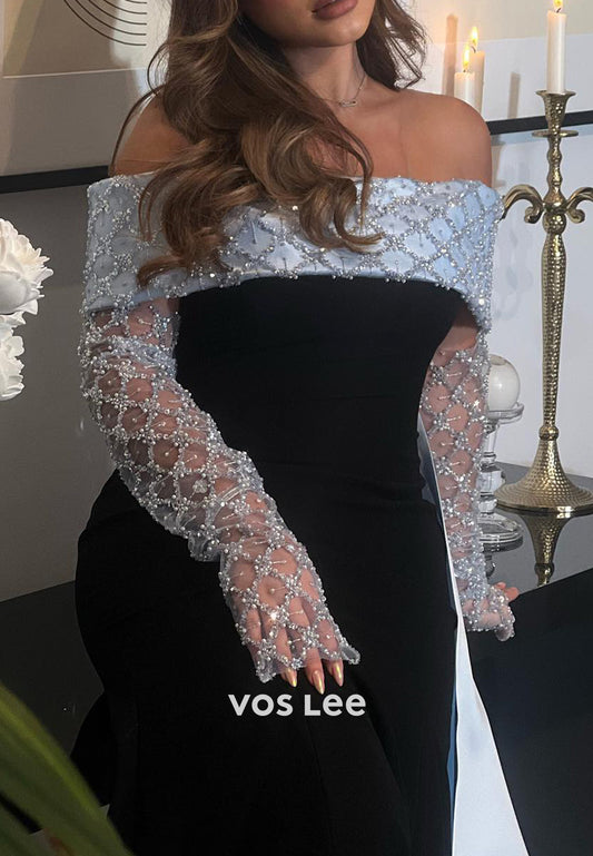 Long Sleeve Off the Shoulder Sequined Beaded Embellished Mermaid Evening Dresses