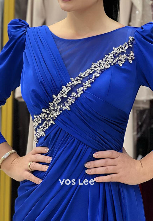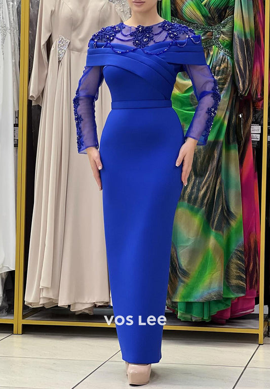 Royal Blue Long Sleeve Scoop Floor-Length Rhinestone Pleated Sheath Evening Dresses