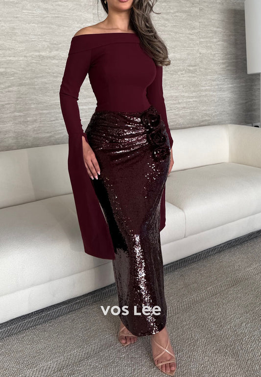 Long Sleeve Off the Shoulder Sequined Flowers Ankle-Length Mermaid Evening Dresses