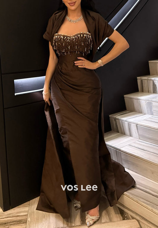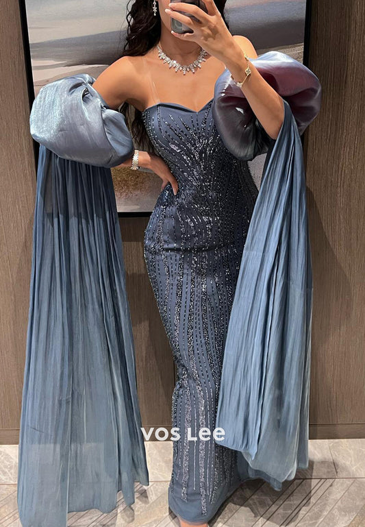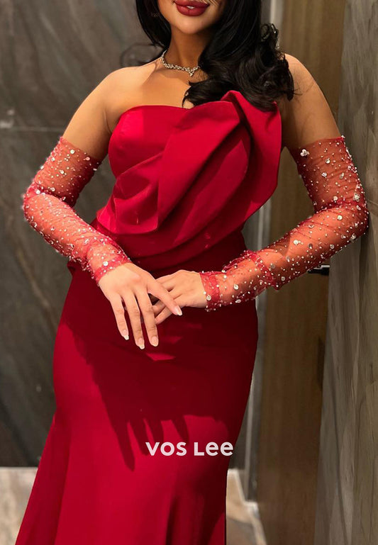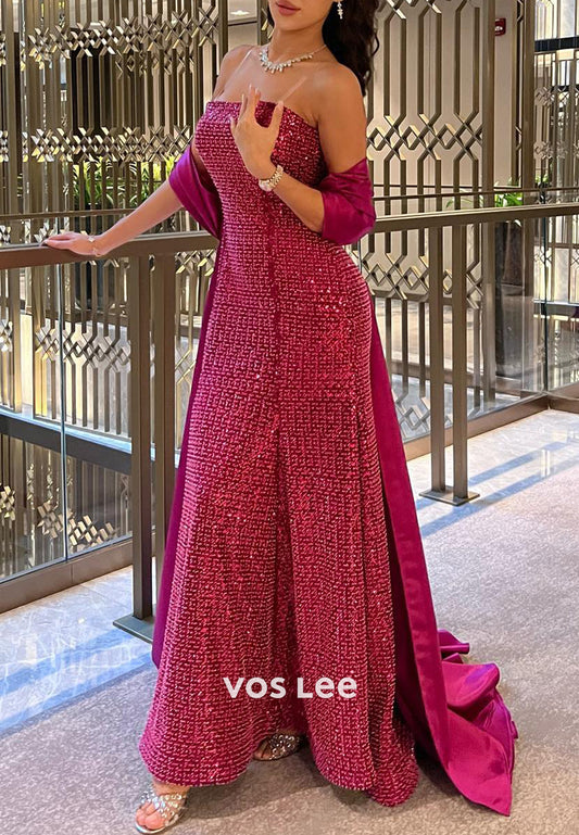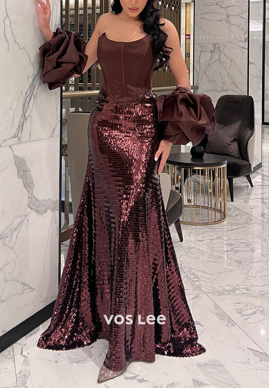 Strapless Sequins Embellished Pleated Long Mermaid Evening Dresses with Court Train