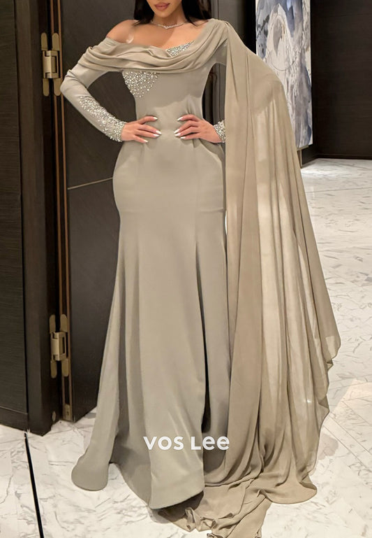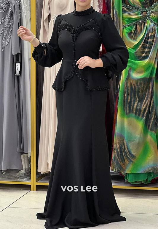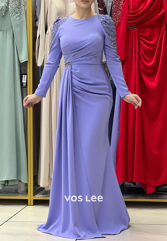 Long Sleeve Scoop Beaded Embellished Floor-Length Mermaid Evening Dresses
