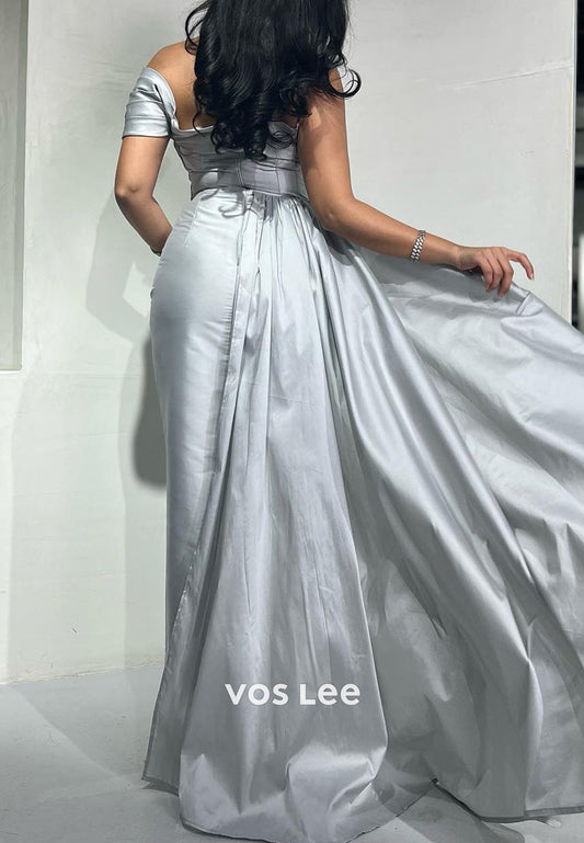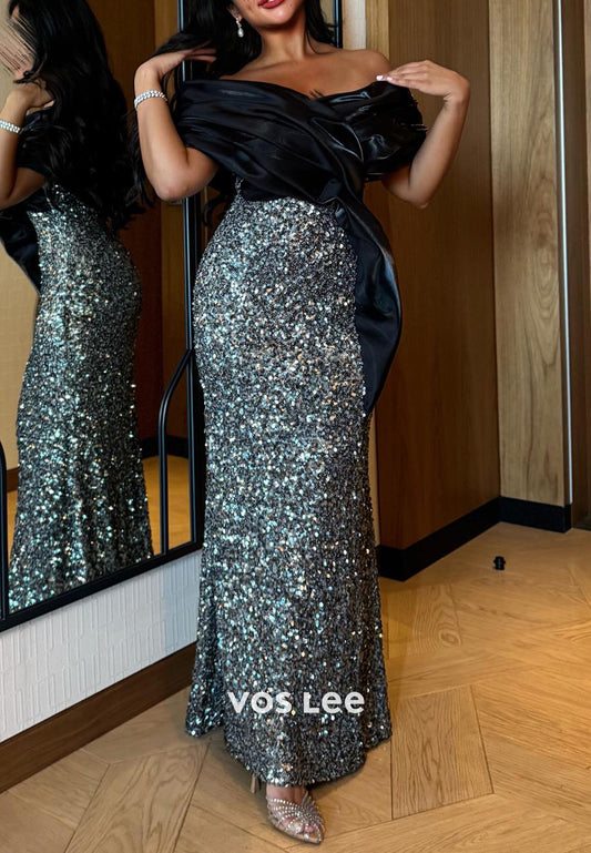 Pleated Off the Shoulder Sequined Floor-Length Pleated Mermaid Evening Dresses