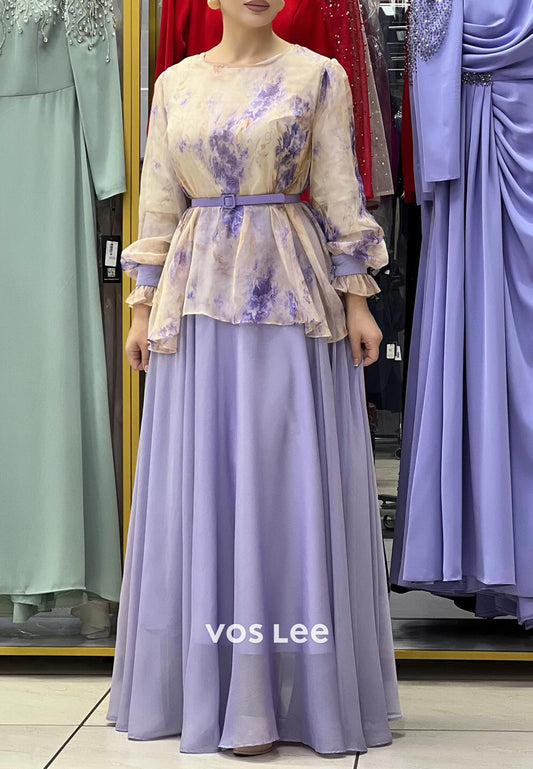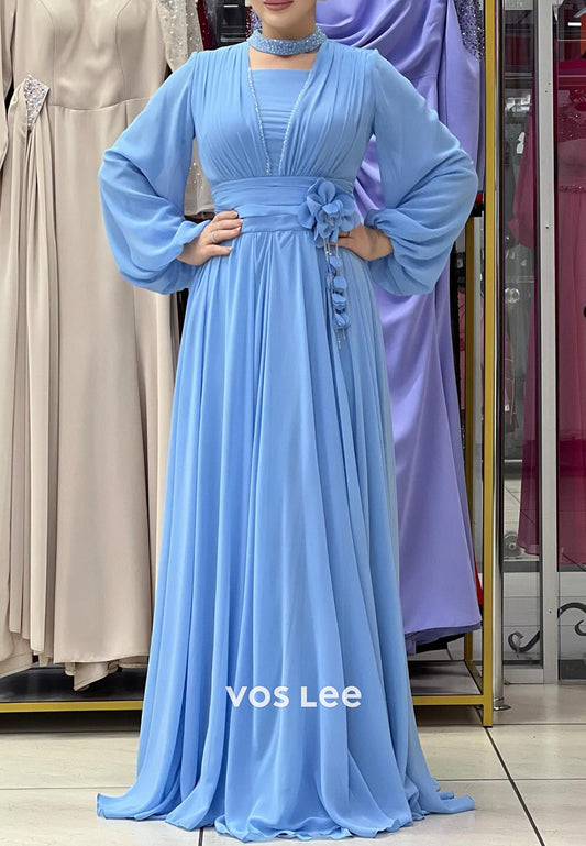 Simple A-Line Long Sleeve Scoop Flowers Floor-Length Pleated Evening Dresses
