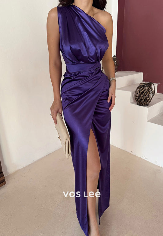 One Shoulder Floor-Length Pleated Mermaid Evening Dresses with High Split