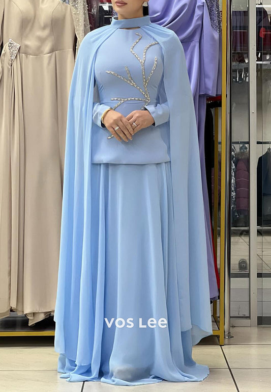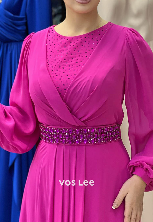 A-Line Long Sleeves High Neck Rhinestone Embellished Pleated Evening Dresses
