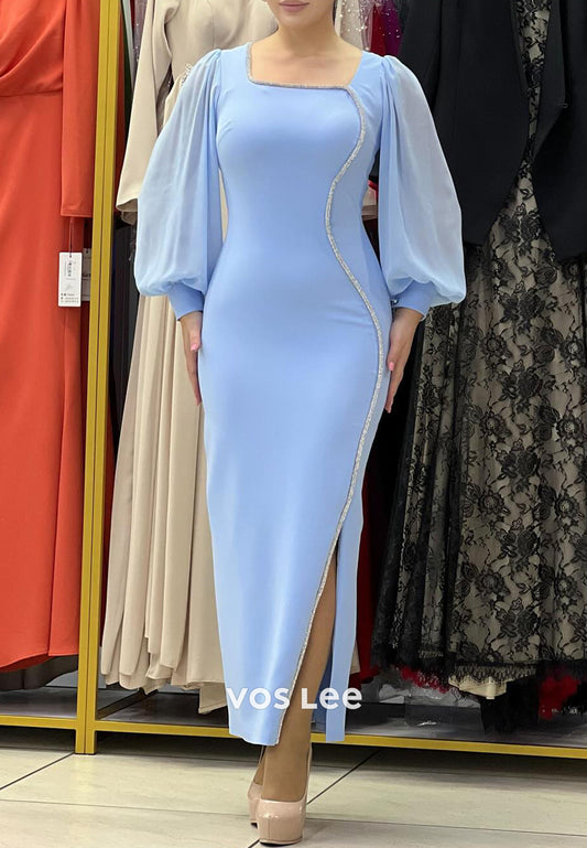 Long Sleeve Square Ankle-Length Mermaid Evening Dresses with Side Split