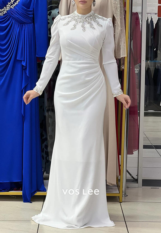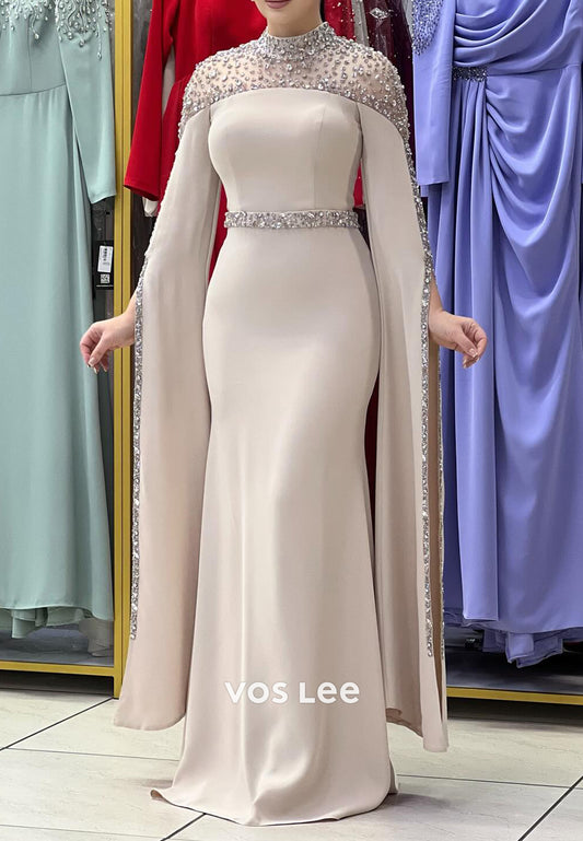 Long Sleeves High Neck Rhinestone Embellished Floor-Length Sheath Evening Dresses