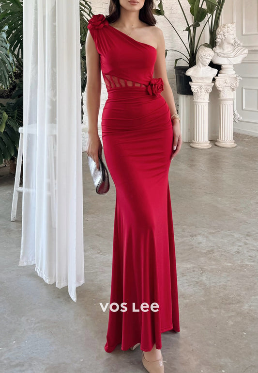 One Shoulder Floral Embossed Floor-Length Pleated Mermaid Evening Dresses
