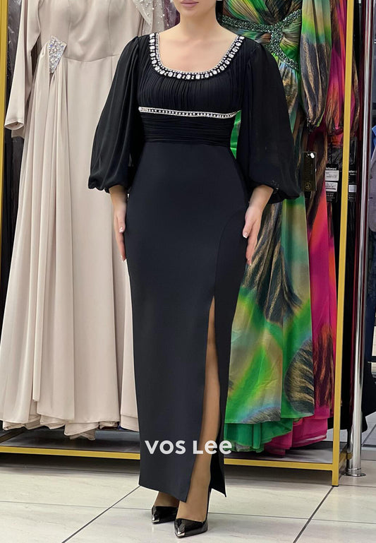 Long Sleeve Scoop Rhinestone Embellished Mermaid Evening Dresses with Side Split