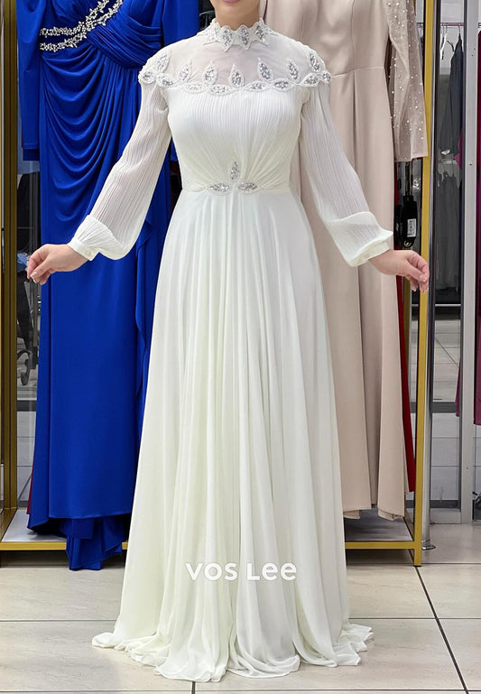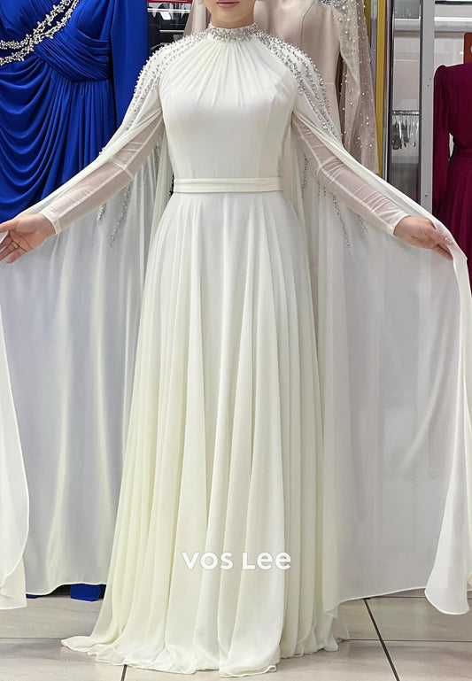 A-Line Long Sleeves High Neck Beaded Embellished Pleated Evening Dresses